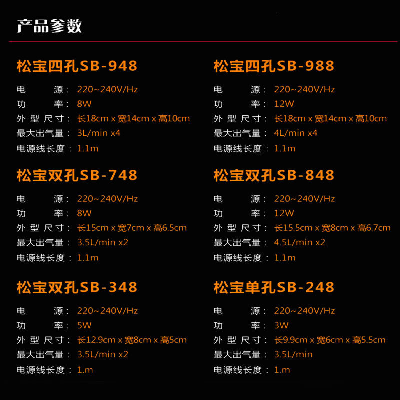 748 Ultra-quiet fine-tuning double-hole 8W848 Ultra-quiet fine-tuning double-hole 12W948 Ultra-quiet fine-tuning four-hole 8W988 Ultra-quiet fine-tuning four-hole 12W5m trachea 5 air stones