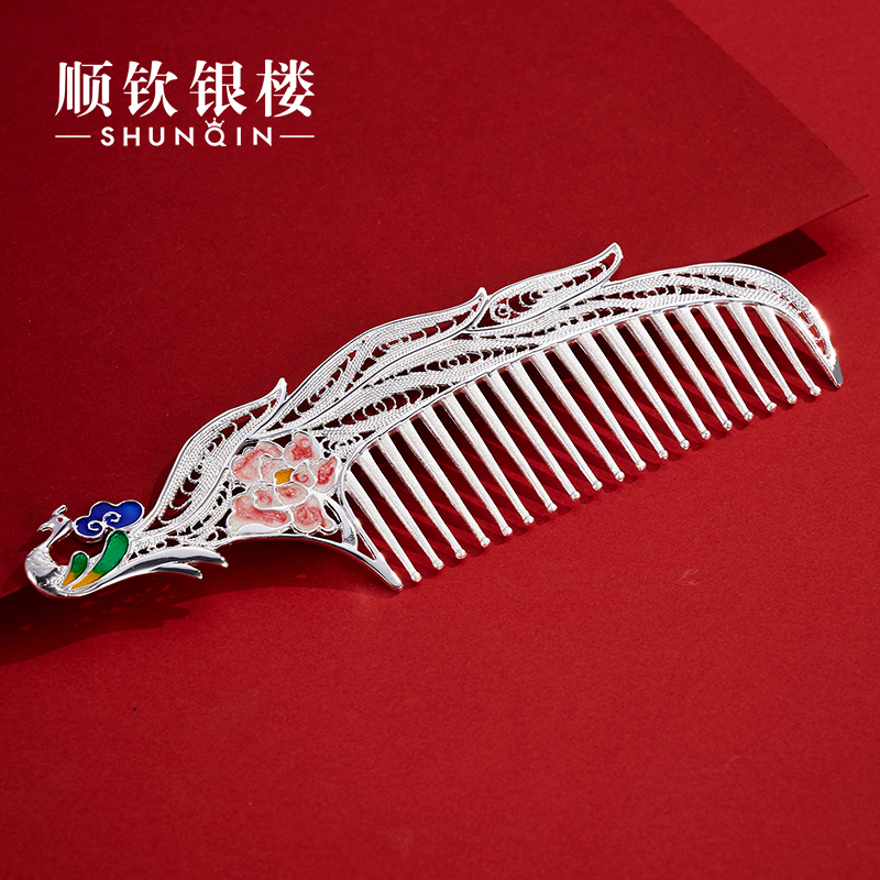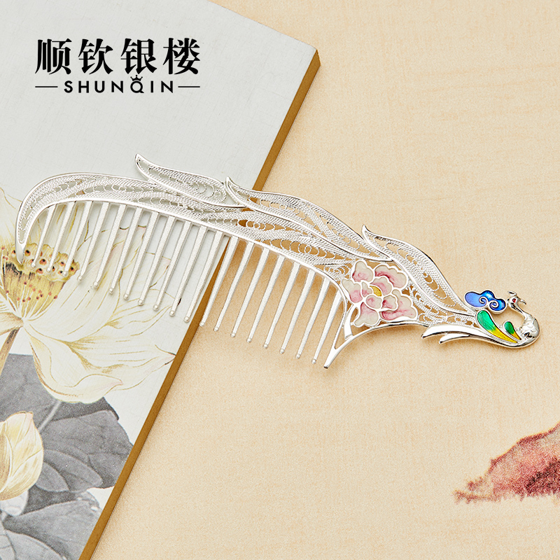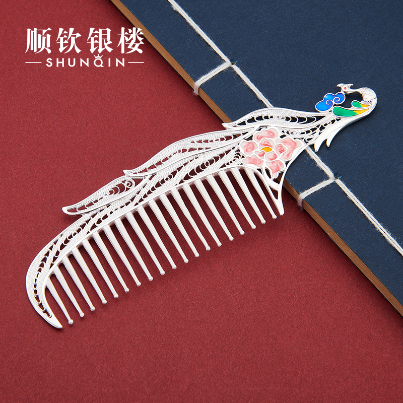 Cischon Silver Building S999 Pure Silver Hair Comb Women's Pure Handmade Colorful Hollowed-out enamel Phoenix Mother's Day gift silver comb