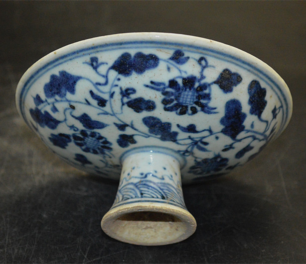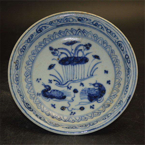 Ming blue and white Mandarin duck play water High foot fruit plate Antique porcelain Antique Hand-painted classical home decoration