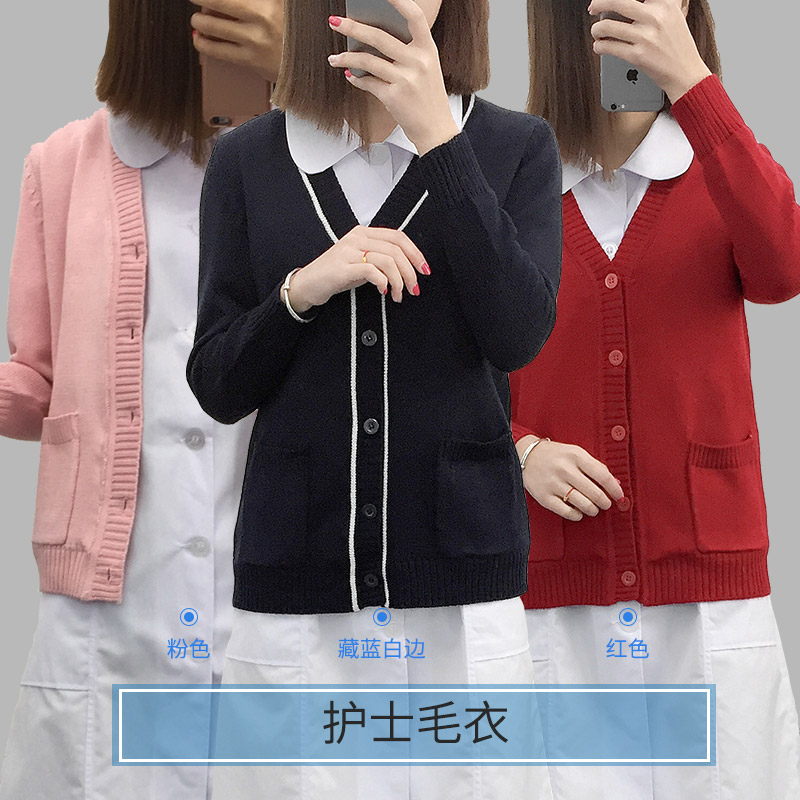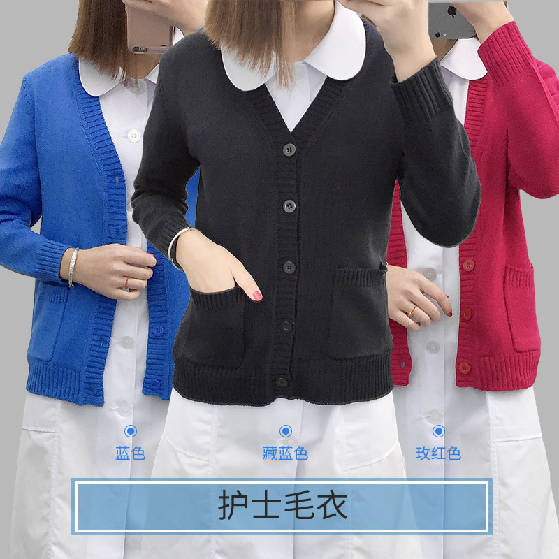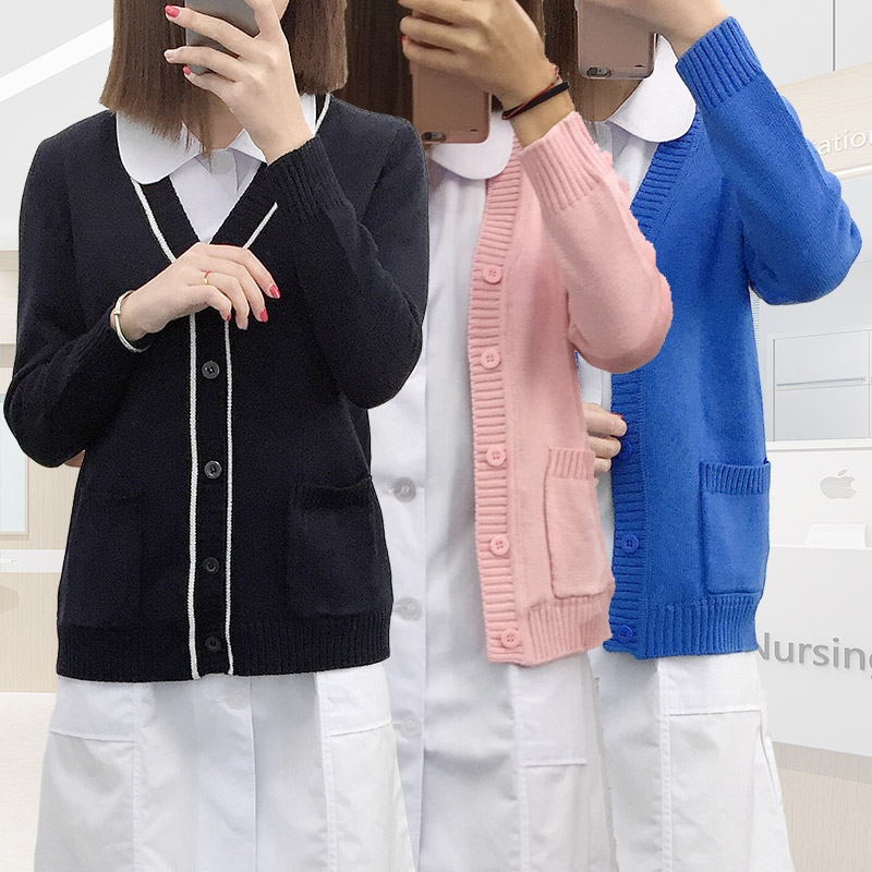 Nurse sweater jacket cardigan thickened velvet Navy blue V-neck knitted cardigan Korean slim fit