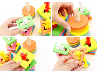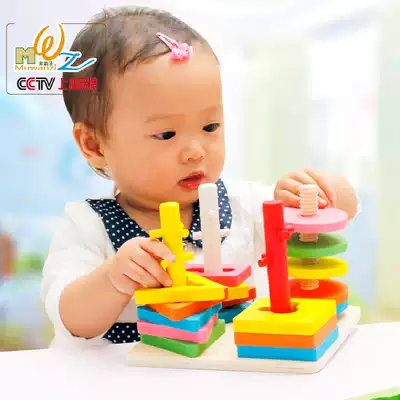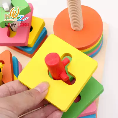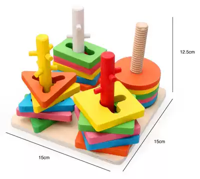 Four sets of columns Qiaozhiwu five-column shape matching beech wood boutique four-column colorful animal sleeve column wooden ball wisdom set small rainbow tower beech wood five-column solid geometric set column cartoon elephant shape set column digital building block column