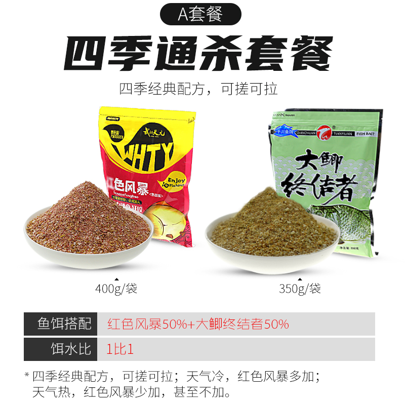 A-Four Seasons Kill (including 1 pack of Red Storm + 1 pack of Giant Crucian Carp) B- Wild Fishing Crucian Carp Old Three (including Red Devil No. 1 2 Pack + Giant Crucian Carp 1 Pack + Fifth Element 2 Pack) C- Spring Wild Fishing Package (including Red Worm Storm 1 Pack + Shrimp Storm 3 Pack) D- Black Pit Crucian Carp (including Crucian Carp Loose Cannon 2 Packs + Shrimp Meat Scatter Cannon 1 Pack) E- Wild Fishing Grass (including 3 Packs of Big Mac + 3 Packs of Tianyuan Super Temptation) F-Fat Head of Silver Carp (including Floating Fishing Carp 2 Packs + Silver Carp Extreme 2 Packs) G- Wild Fishing New 3 Pieces (including 5 Packs of Bait)