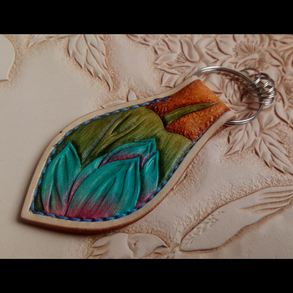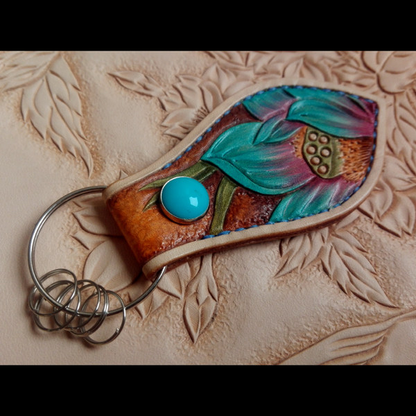 Handmade leather key keychain paperback painted blue lotus keychain buckle