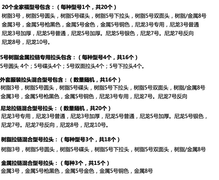 Commonly used all models zipper pull family portrait 20 No. 5 resin metal zipper special puller 16 coat garment puller mix model 16 nylon code zipper mixed model 20 resin zipper mixed model 18 metal zipper mixed type puller 15 nylon zipper puller No. 5 and No. 8 10 each 10 No. 3 resin zipper pull 20 no. 5 resin zipper with 20 round toe No. 5 resin zipper with 20 round head No. 5 resin zipper with 20 pieces Butterfly head No. 5 resin round toe 10 + disc head 10 no. 8 resin zipper with 10 no. 3 metal zipper 20 no.5 metal zippers with 20 no.5 metal zippers with 20 copper color no. 8 metal zippers with 10 no. 3 nylon zippers with 20 no. 7 (no. 5) nylon zippers with 20 no. 7 (no. 5) nylon zippers with 20 reverse no. 3 nylon ordinary zippers 20 no. 3 nylon thickened zipper tips 20 no. 5 nylon thickened zipper tips 20 no. 8 nylon pullers 10 no. 10 nylon thickened zipper tips 10