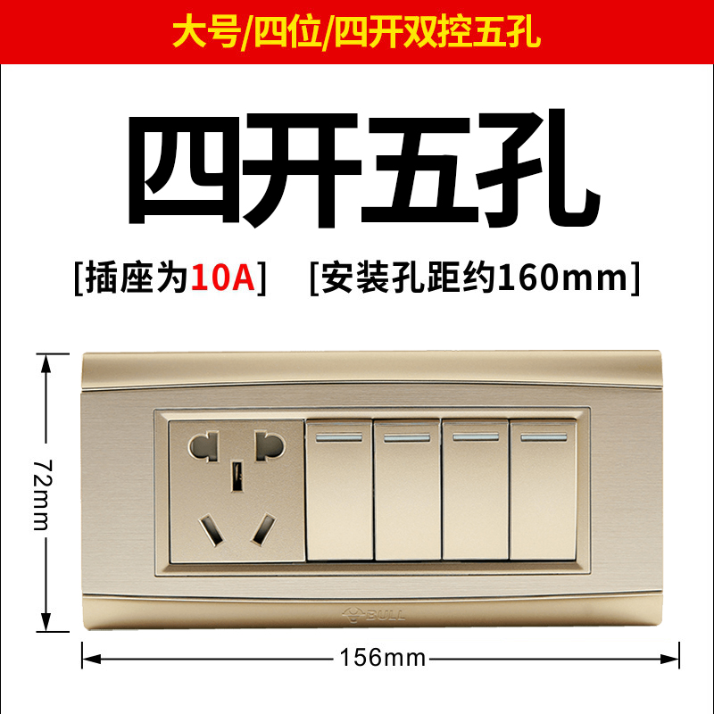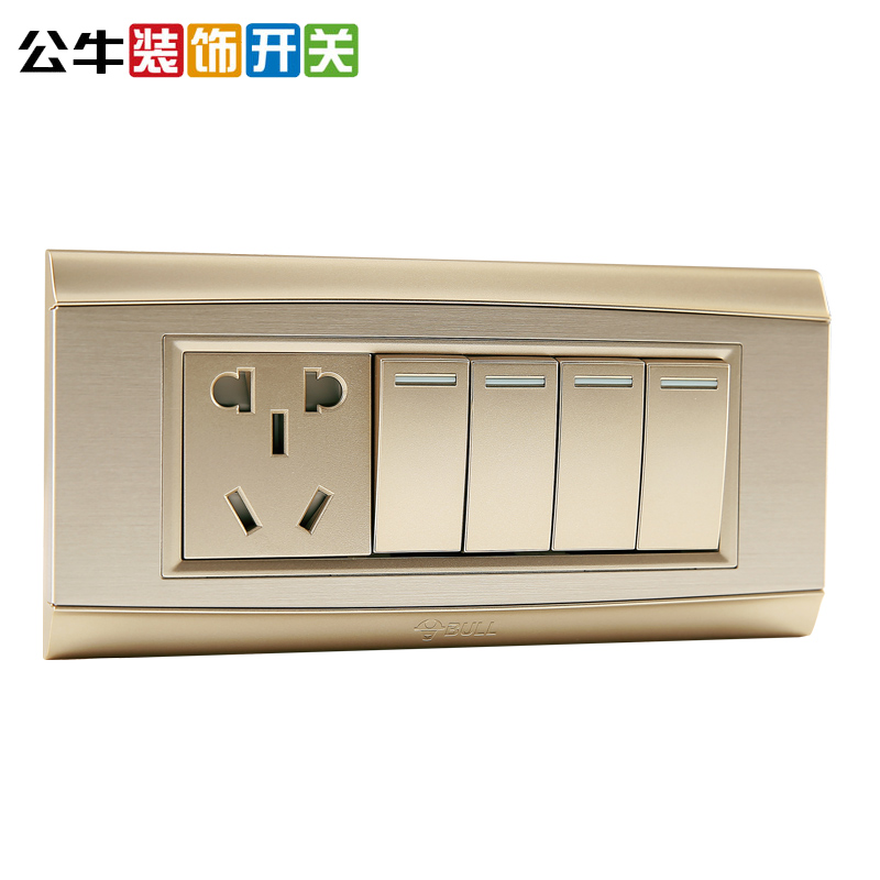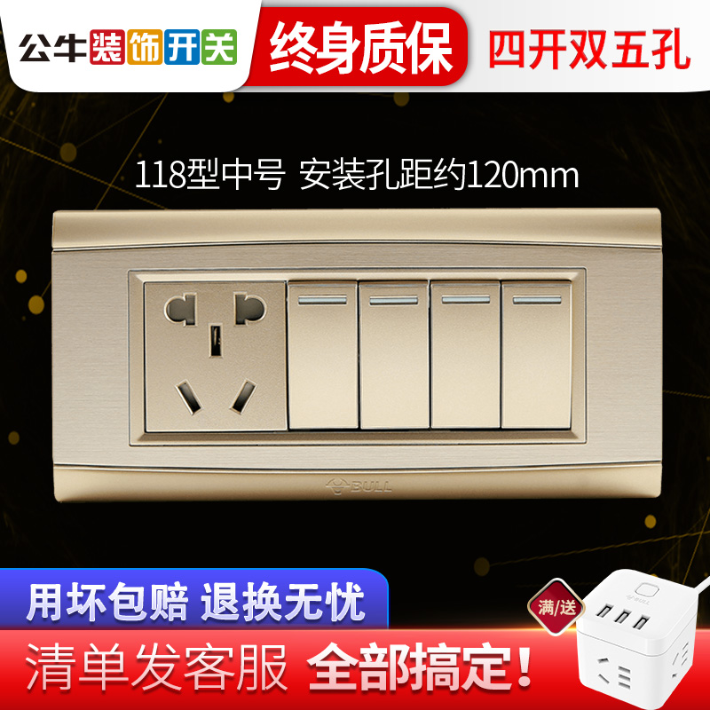 Bull switch socket panel porous 118 type three-position 4-opening 5-hole wall household four-opening double five-hole brushed gold