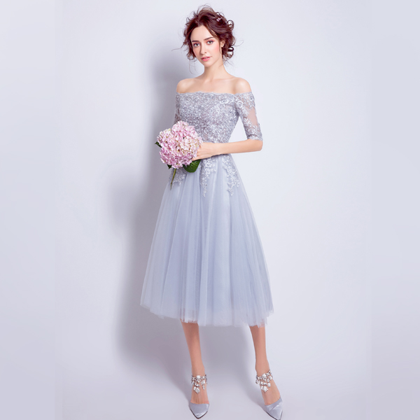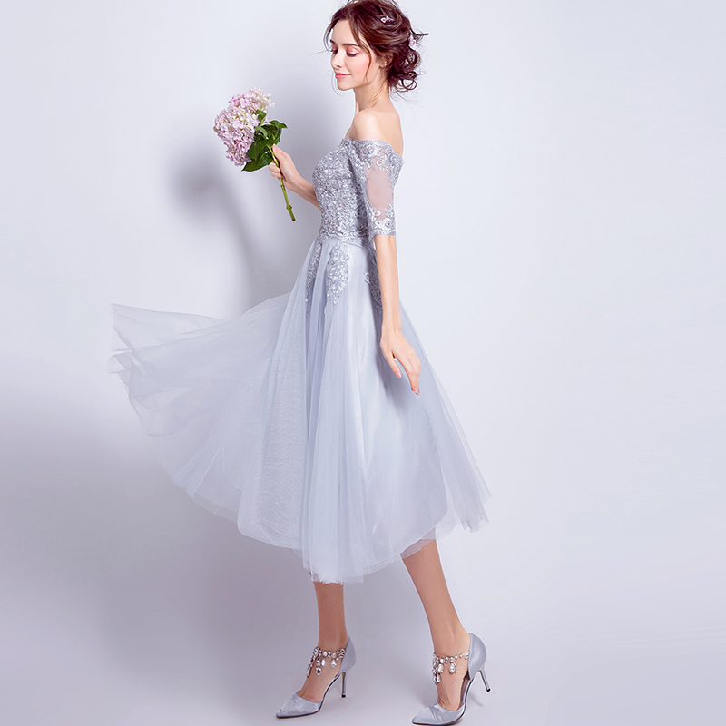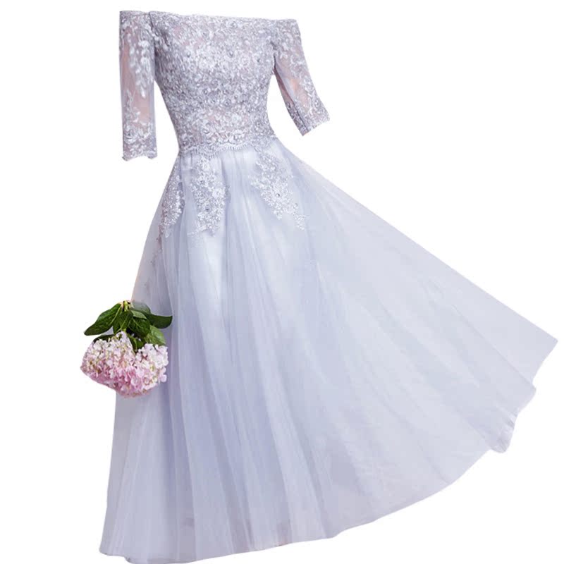 Angel wedding dress grey lace French style long sleeve banquet Annual birthday performance Short version Wedding Gown 6878