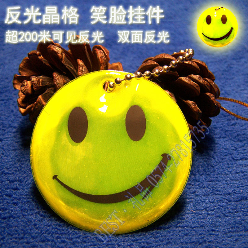 A yellow-green smiley face reflective pendant