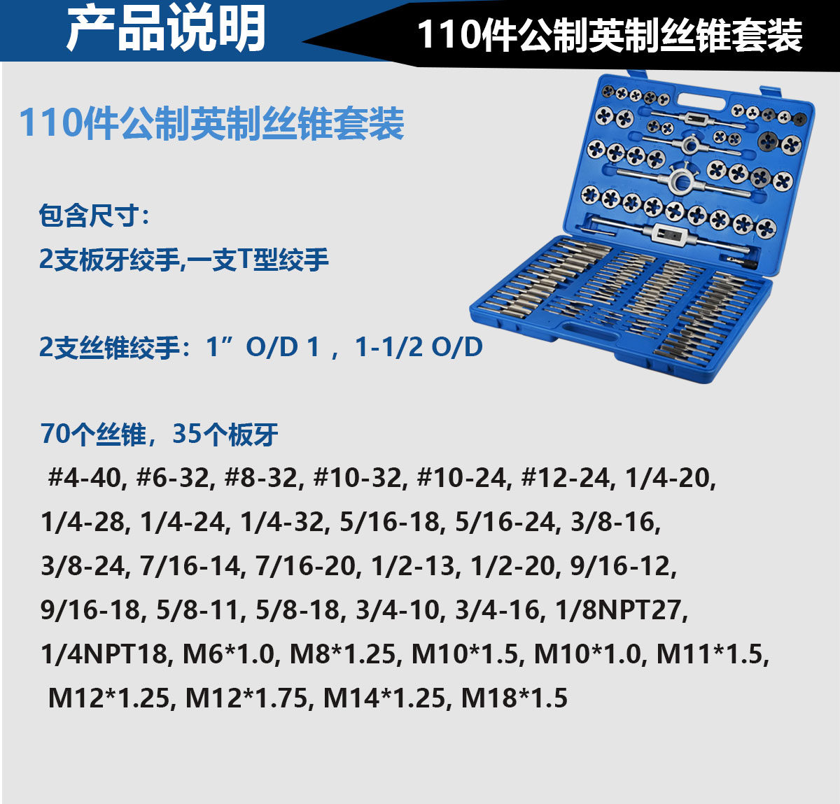 Metric 110 pieces manual tapping tapered plate tooth set set combination bearing steel threading machine with round hinge wrench