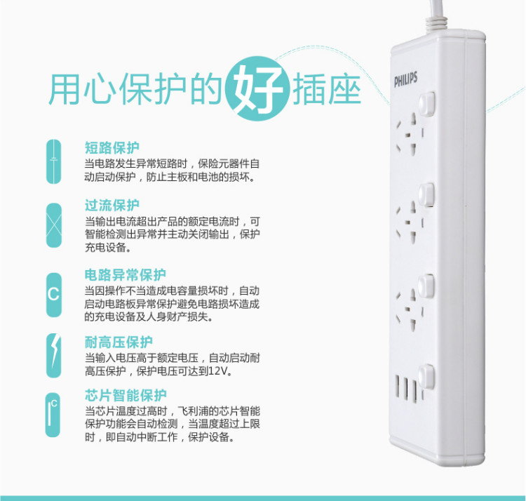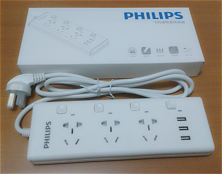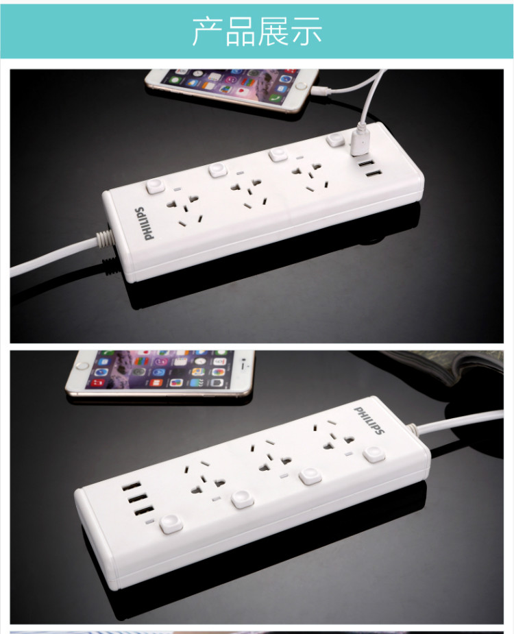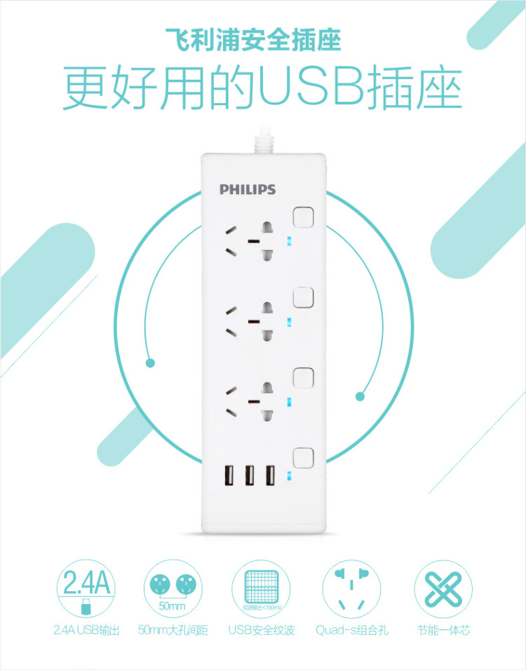 Philips USB socket wiring board Smart platoon plug 2 4A3USB mouth 1 8 m drain plug