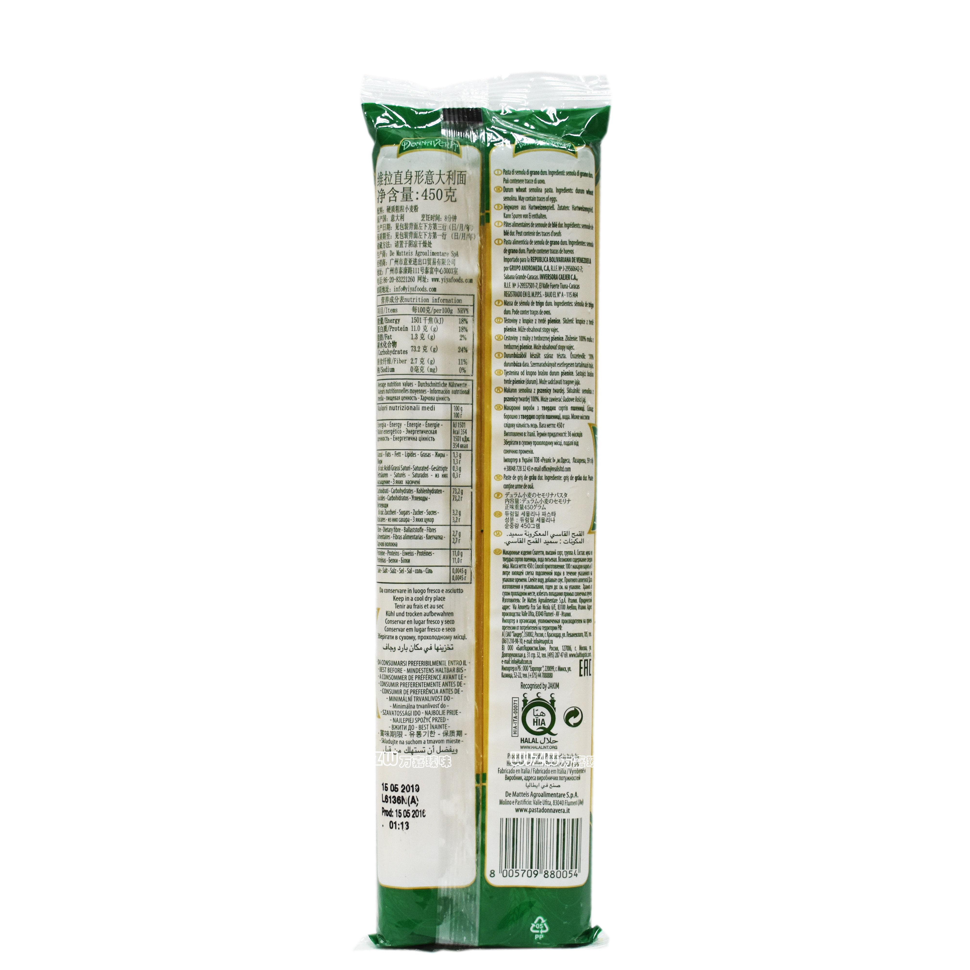 Vera straight body type Italian noodles 450g straight face straight strip noodles Italy imported pasta buy 5 packs