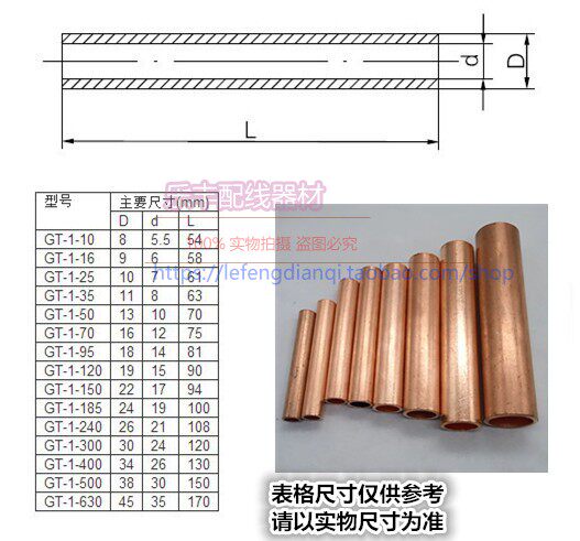 GT-25 square straight-through copper pipe T2 copper connector connected to 25mm2 cable middle joint through-hole pipe head