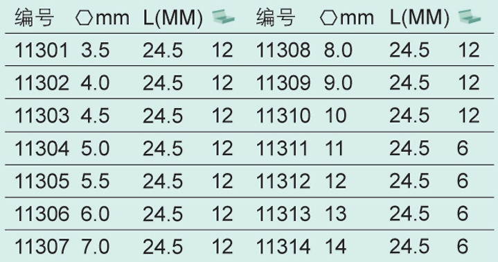 11301 Specifications 3 5mm11302 Specifications 4mm11303 Specifications 4 5mm11304 Specifications 5mm11305 Specifications 5 5mm1130