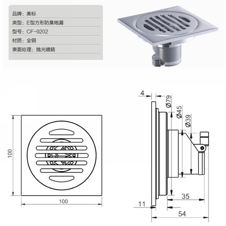 American Bathroom Cleaning Appliance 9202 All Copper Chrome Floor Drain Type E Square Odor Proof Floor Drain Washing Machine Floor Drain