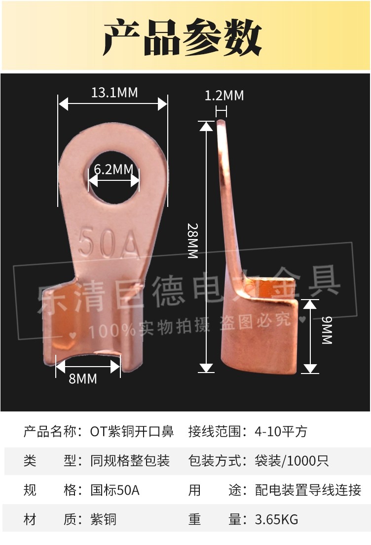Open nose OT-50A copper nose copper connector wire ear copper terminal 1000 GB A thickened copper