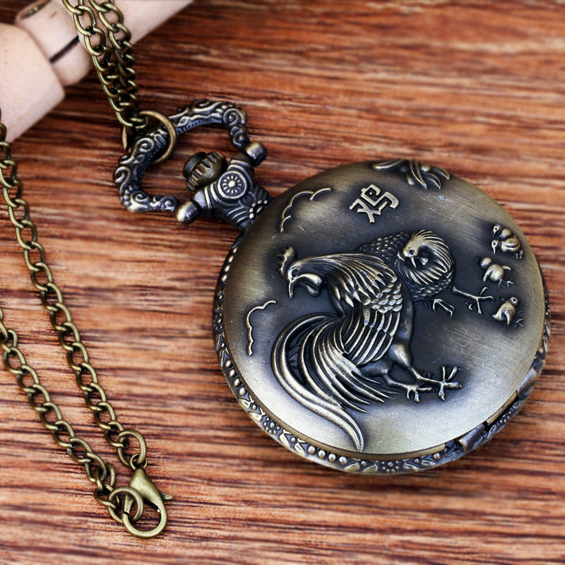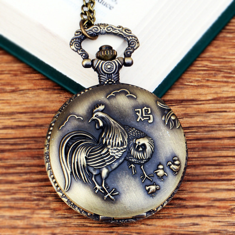 Large Size Fine Chain Ancient Bronze Color Zodiac Chicken Quartz Watch Retro Relief Large Male Watch 0