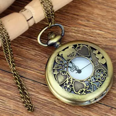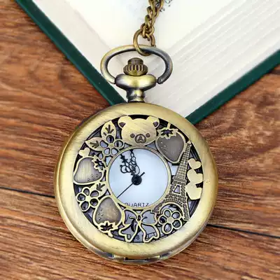 Large fine chain bronze hollow cub retro quartz pocket watch inside white face black iron tower pocket watch 8860