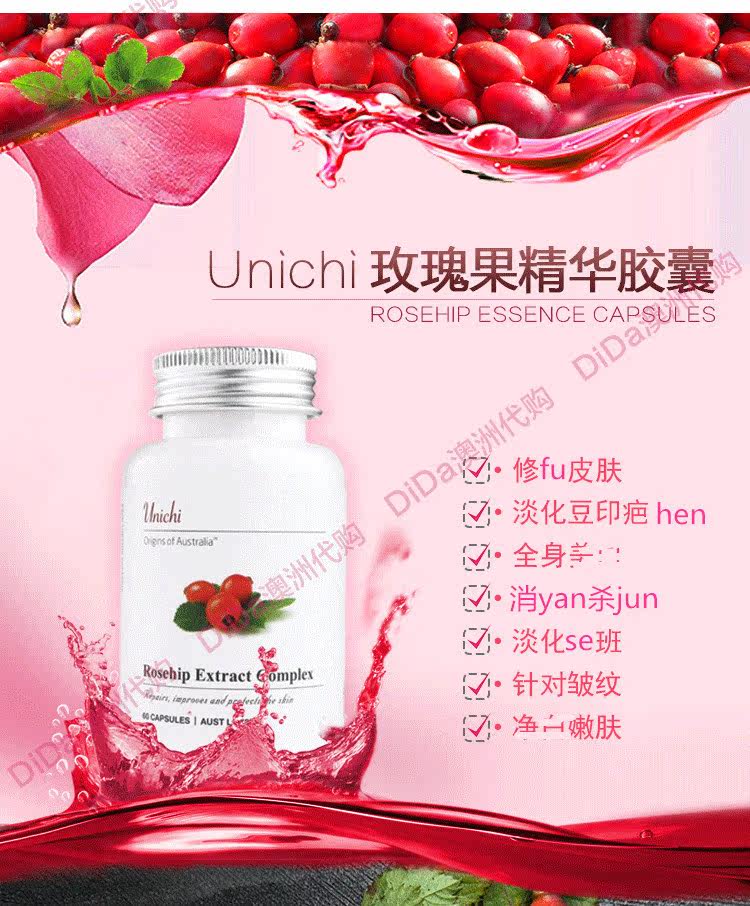 Australian Unichi RoseHip Extract Capsules Boost Skin Tone Whitening Grape Seeds Reduce Melanin 60 Capsules
