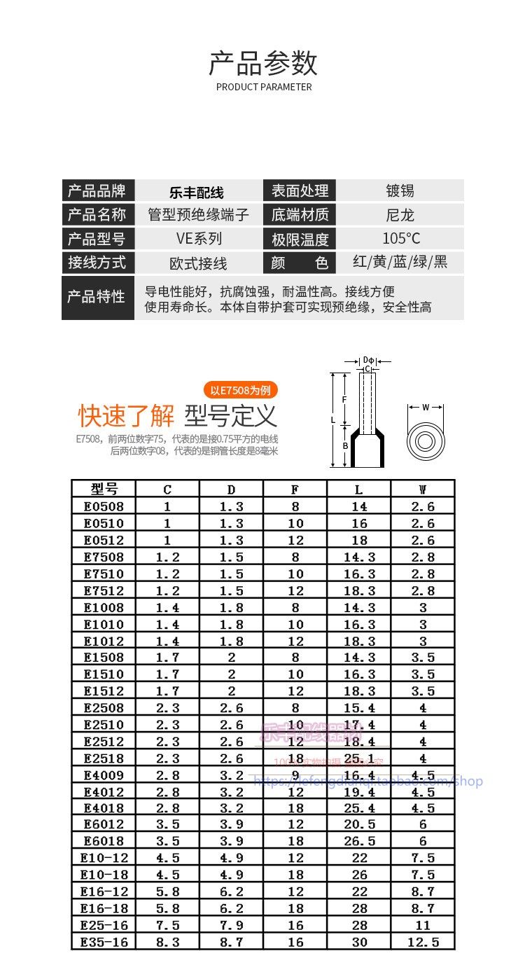 VE7508 tubular terminal needle shaped cold pressing wire ear 0 75 square wire copper end head brass 1000 only fit