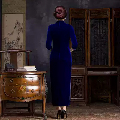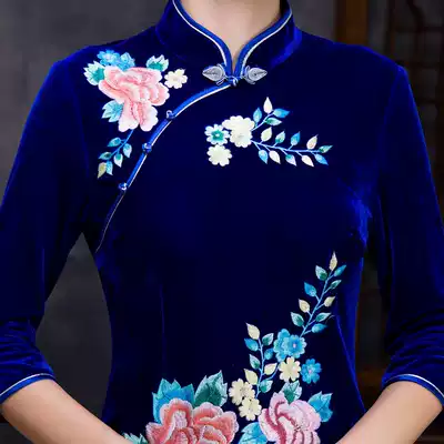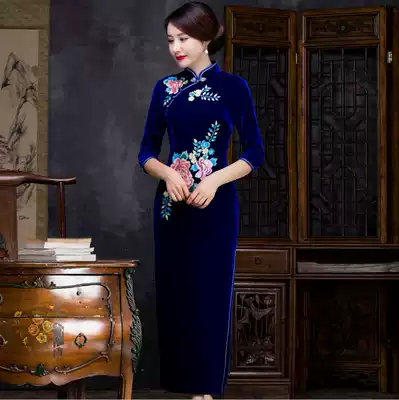 Special clearance Peony embroidered gold velvet cheongsam long version of the elderly cheongsam dress wedding mother Tang suit