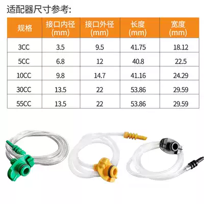 3CC Green adapter 5CC Green Adapter 10CC Green Adapter 30CC Green Adapter 55CC green adapter Separate sealing ring Photographed Remarks Specifications Separate transparent trachea