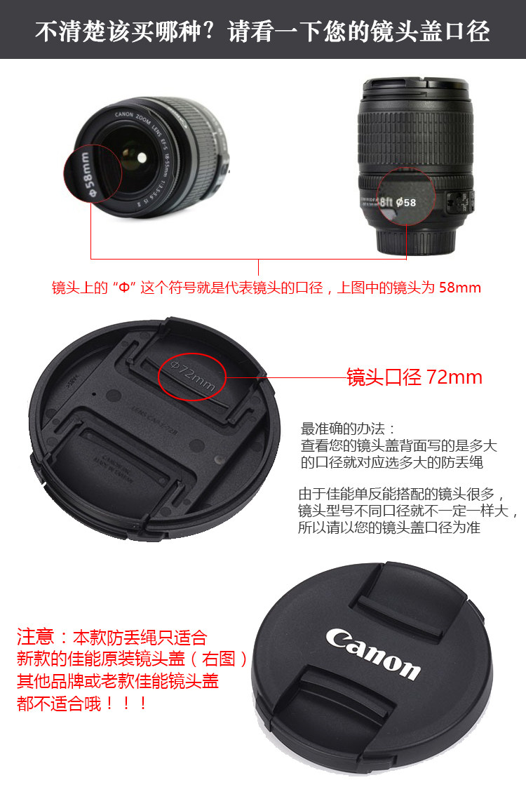 Suitable for 43mm diameter lens cover Suitable for 49mm diameter lens cover Suitable for 52mm diameter lens cover Suitable for 58mm diameter lens cover Suitable for 67mm diameter lens cover