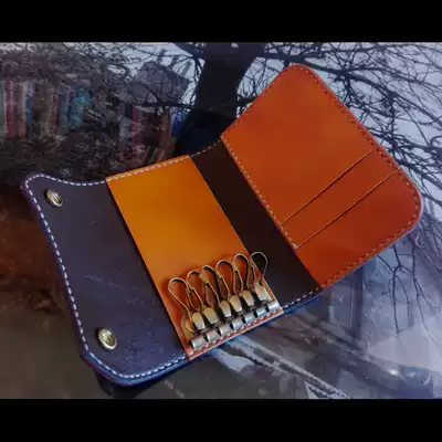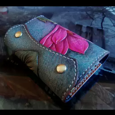 Handmade leather men's bag women's bag custom leather carving painted gray blue magnolia multi-function female key bag