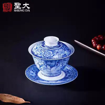 San Cai Gaiwan Teacup ceramic Jingdezhen hand painted blue and white flowers Xianrui tea bowl handmade Gongfu tea set