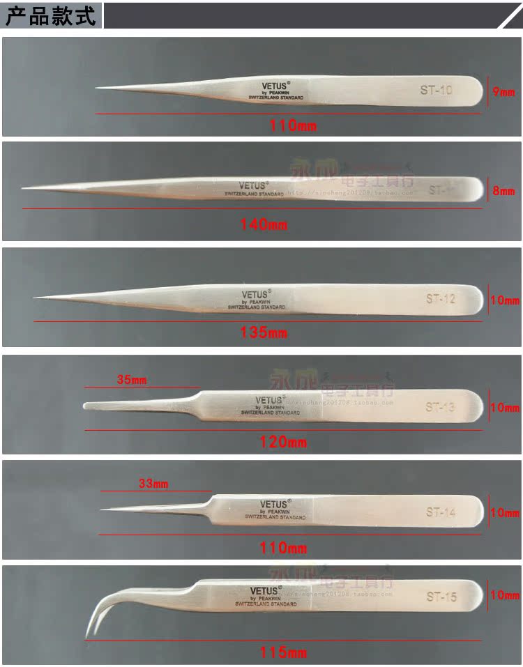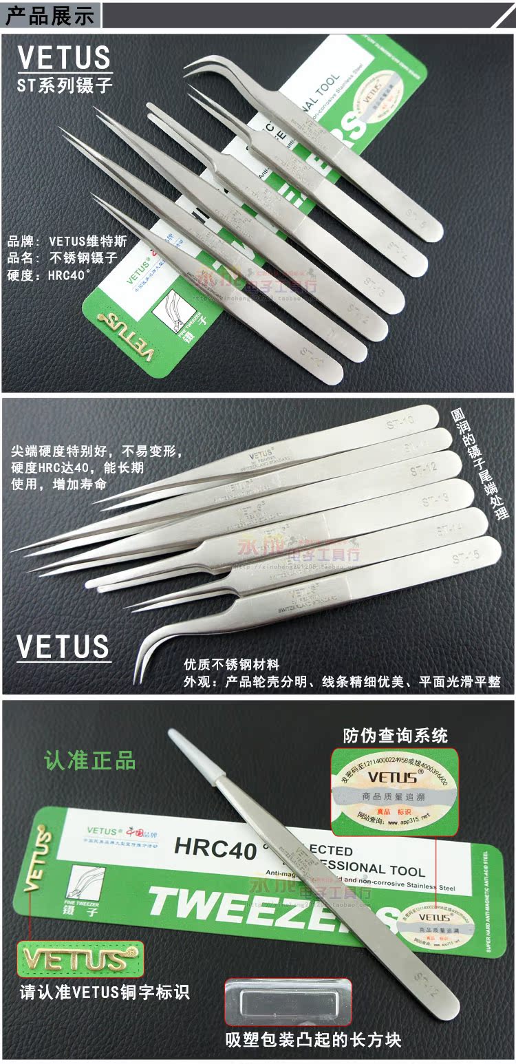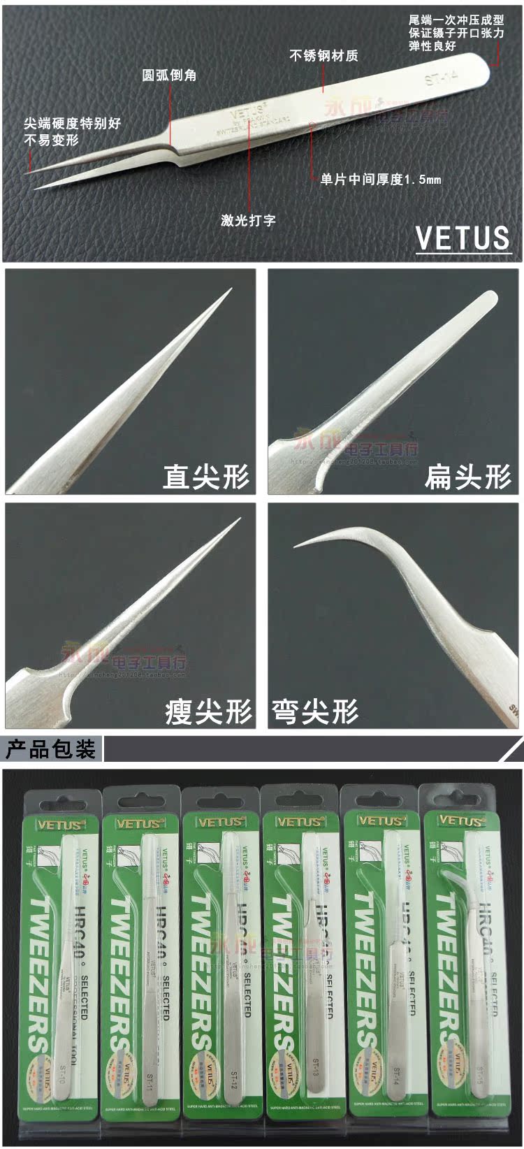 VETUS Stainless Steel Tweezers Watch repair elbow tweezers Nest Picking capillary pointed Precision clips ST-11