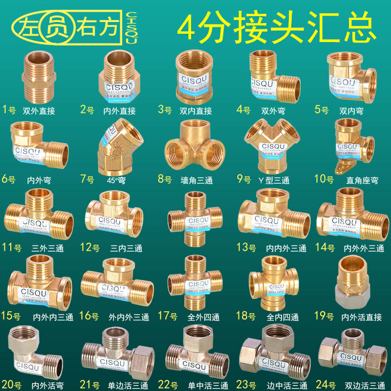 No. 1 Copper Double Outer Direct 2 Copper Inside and Outside Direct 3 Copper Double Inner Direct 4 Copper Double Inner Bend No. 5 Copper Double Inner Bend 6 Copper Inside and Outside Bend No. 7 Copper 45° Bend 8 Copper Wall Corner Tee No. 9 Copper Y Type Tee No. 10 Copper Right Angle Seat Bend 11 Copper Three Outer Tee 12 Copper Inside and Outside Tee 13 Copper Inside and Outside Tee 14 Copper Inside And Outside Outside Tee 15 Copper Inside and Outside Tee 16 Copper Inside and Outside Tee 17 Copper Full Outer Four-Way 18 Copper All Inside Inside Four-Way No. 19 Copper Inner and Outer Active Direct 20 Copper Inside and Outside Live Bend No. 21 Copper Unilateral Live Tee No. 22 Copper single live tee No. 23 Copper side live tee No. 24 Copper bilateral live tee