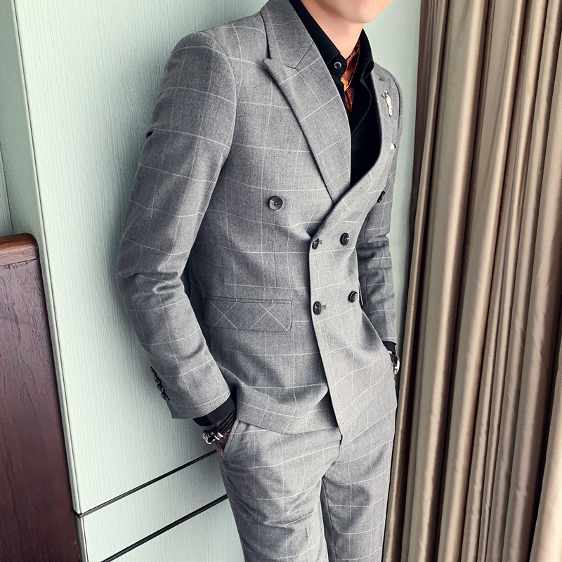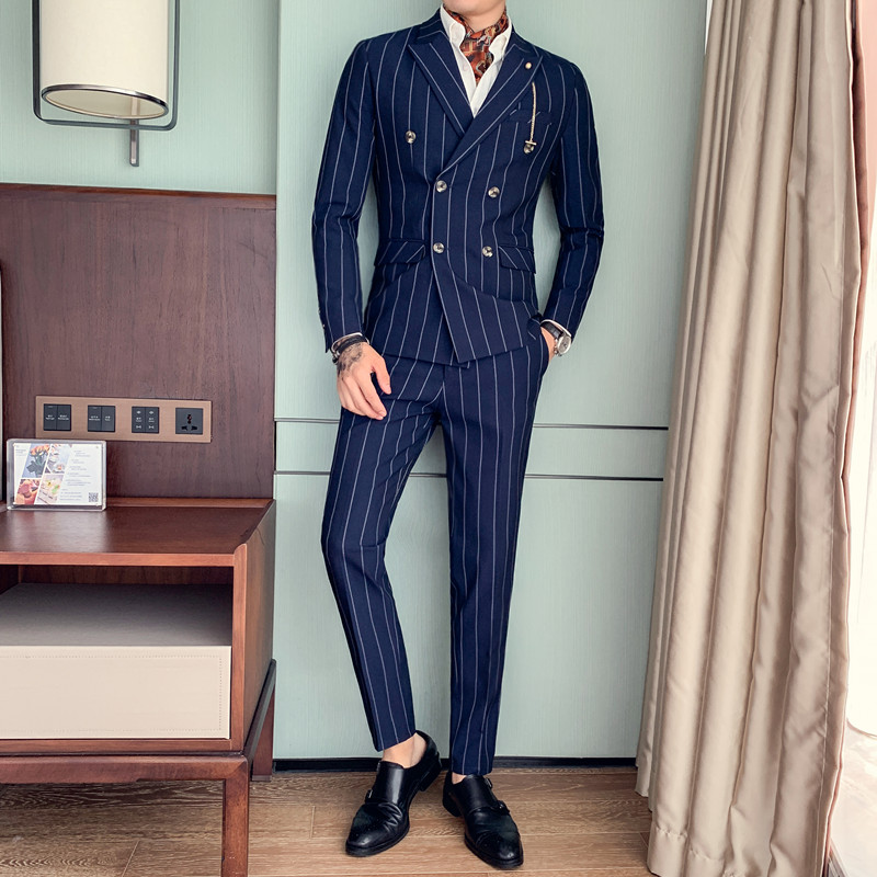 Spring Korean version of men's slim striped suit two-piece fashion youth double-breasted suit suit groom dress