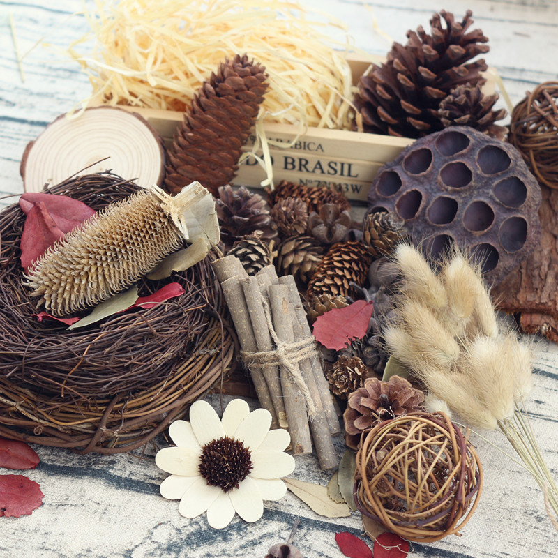Large set kit small bark 3 pine wood slices a rattan a bird nest a flower ring a red leaves 20 slices brown leaves 20 slices of wood skin dried flowers a lotus flower a big pine nuts a big pine nuts a small pine