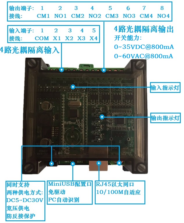 4 optocoupler inputs + 4 relay outputs (ethernet port)