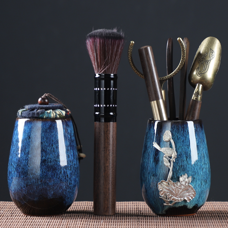 Sand Gold Glazed Tea Ceremony Barrel (Songhe Yannian) Black Sandalwood Brush Tea Ceremony