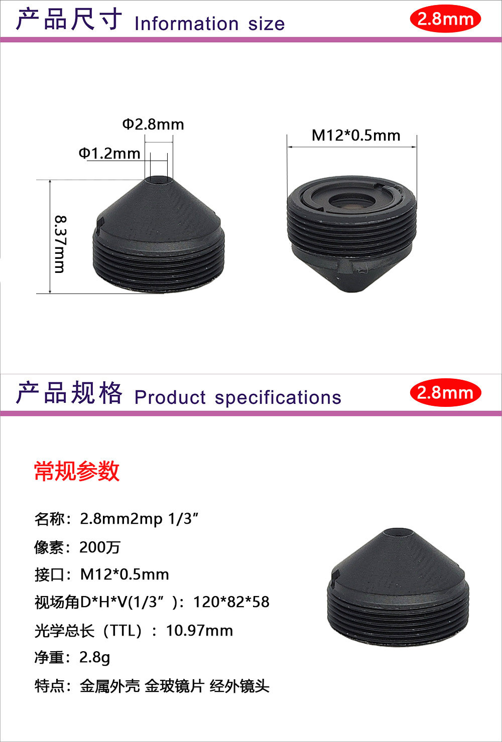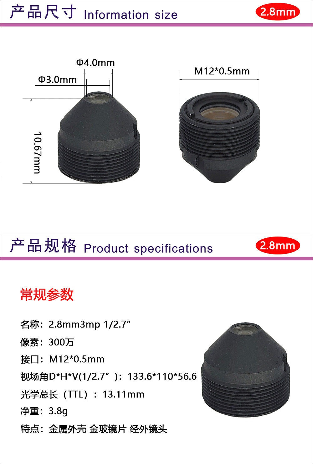 Cone lens 2 8mm HD 3 million pointed mouth M12 interface wide angle lens monitoring equipment accessories 2 million