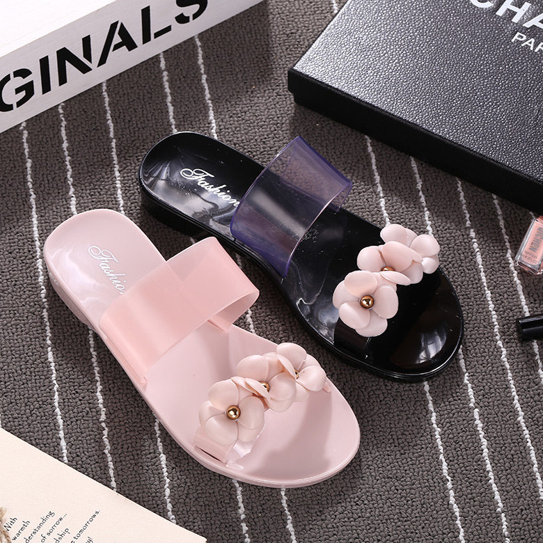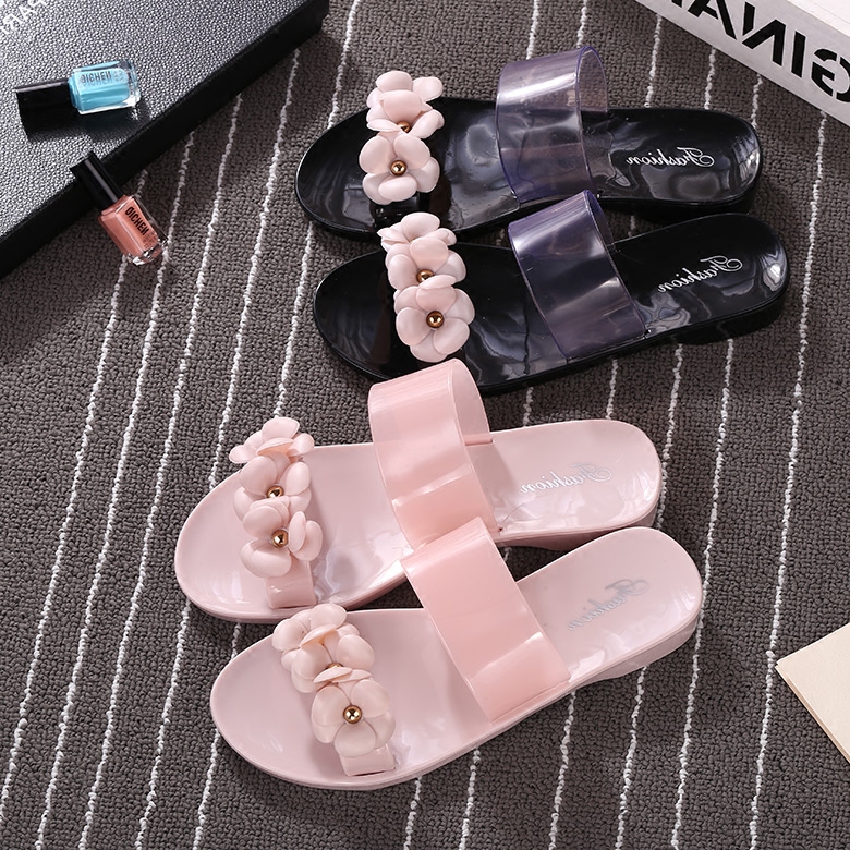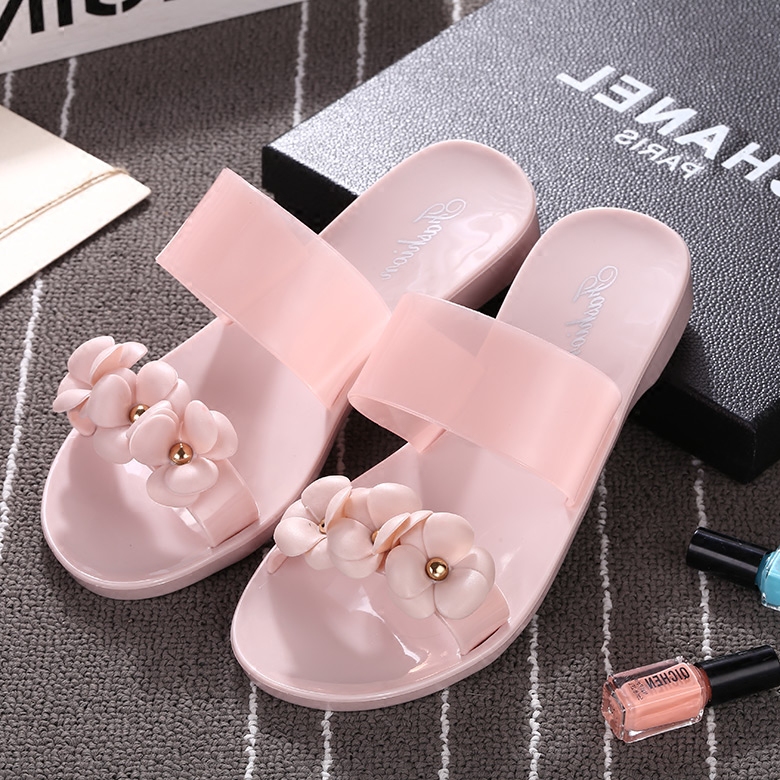 Net red lined with thick bottom crystal jelly flower sandals Slippers Women Summer Fashion Beach Wear 100 hitch Han version Slope heel