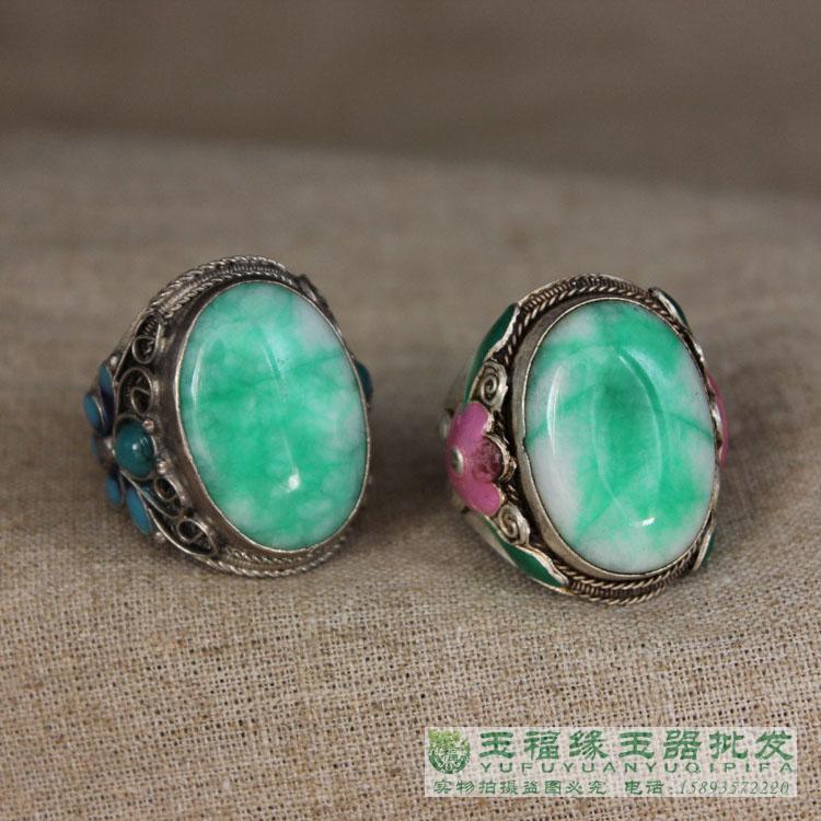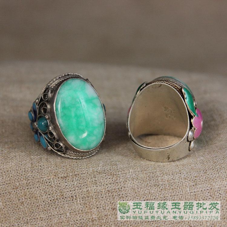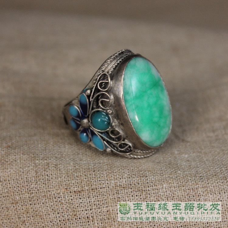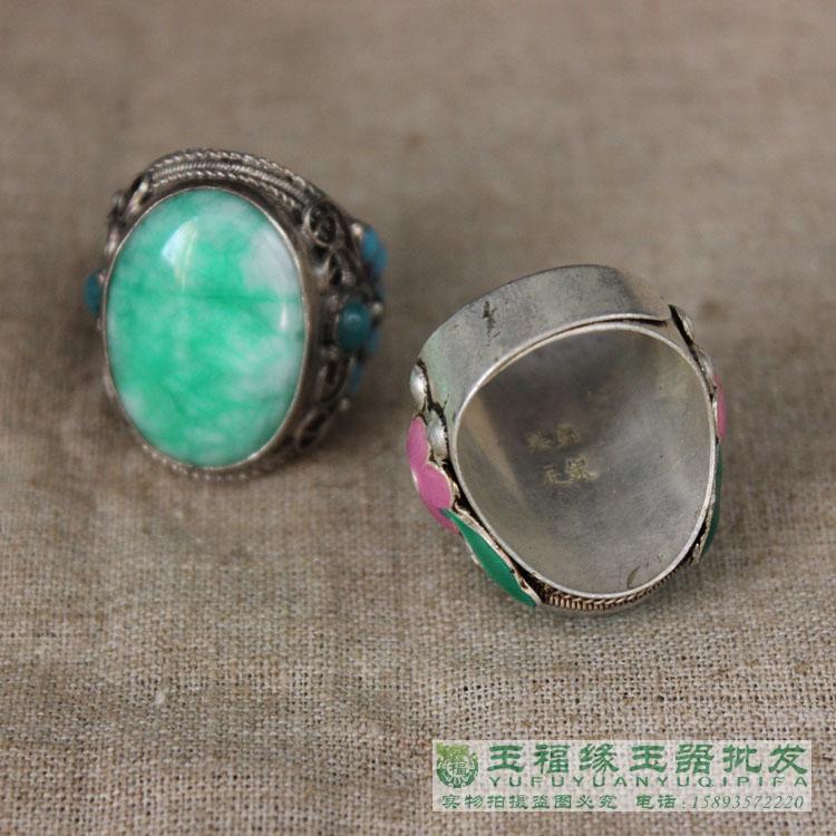 Ancient play miscellaneous Tibetan silver Jingtai blue inlaid jewel jade stone green jade jade ring inner diameter adjustable
