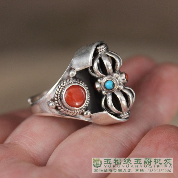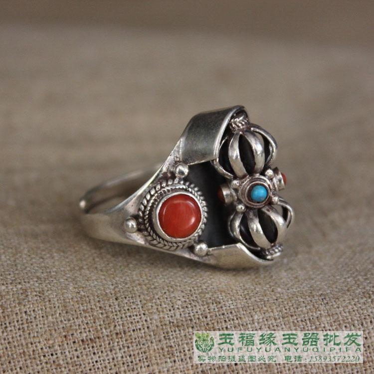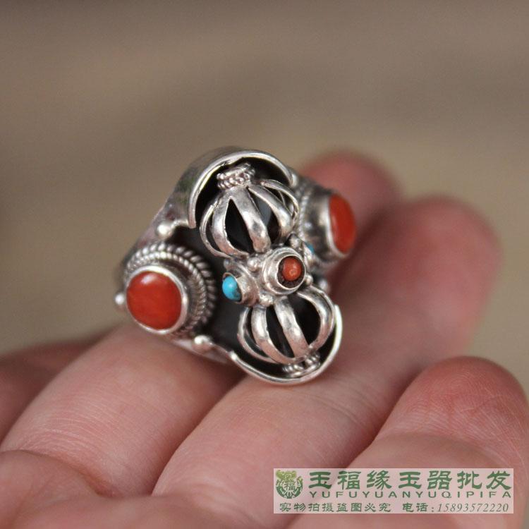 Nepalese handmade 925 pure silver opening ring male and female coral red forwarding bead ring retro national wind ornament