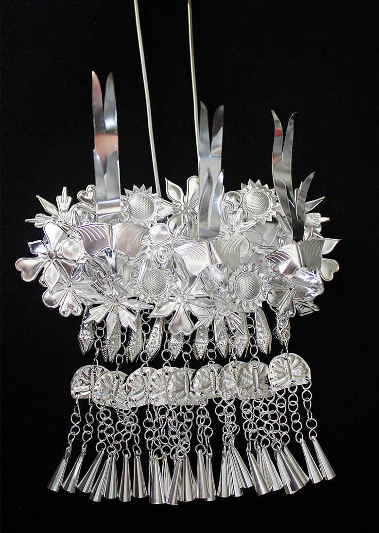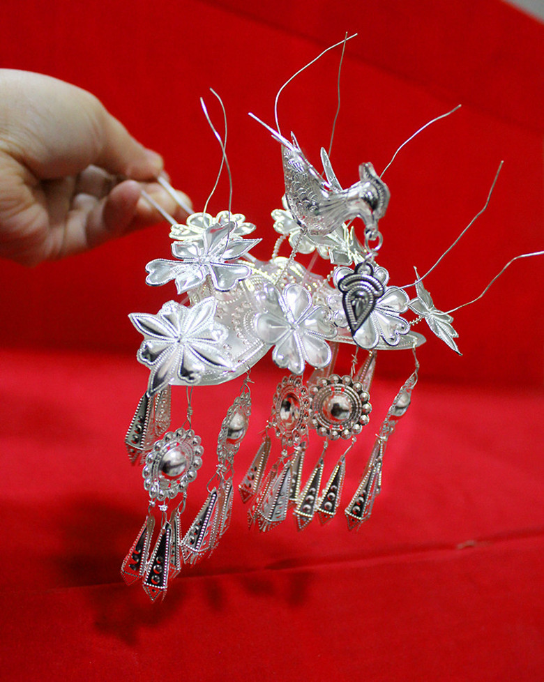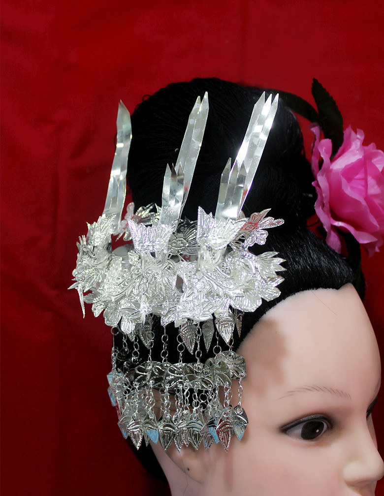 Miao and Dong ethnic silver headdress court style step hairpin crew costume bride stage headdress long tassel hair cake
