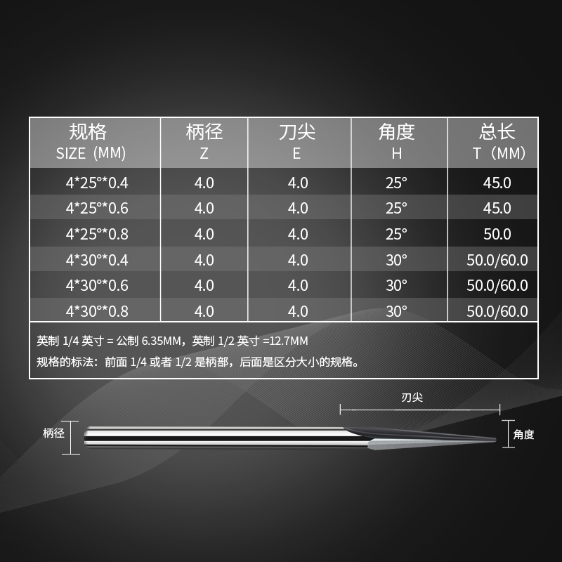 Handle diameter * full angle * knife tip diameter * Total length straight groove sharp knife Phi 4 * 15 degrees 0 5 * 45L straight groove sharp knife Phi 4 * 15 degrees 0 8 * 45L straight groove sharp knife Phi 4 * 15 degrees 1