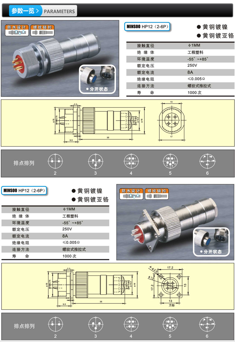 Waterproof PLUG SOCKET HP12-2 Core 3 Core 4 Core 5 Core 6 Core 12MM Connector 16MM Square Round Sail