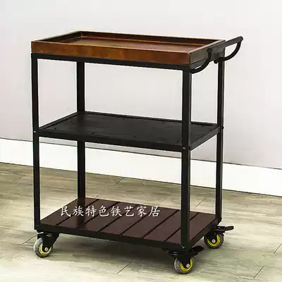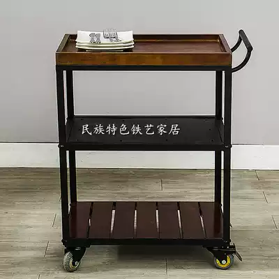 Wrought iron solid wood dining car Fashion wine trolley Creative mobile small dining car wine rack Retro dining side cabinet American
