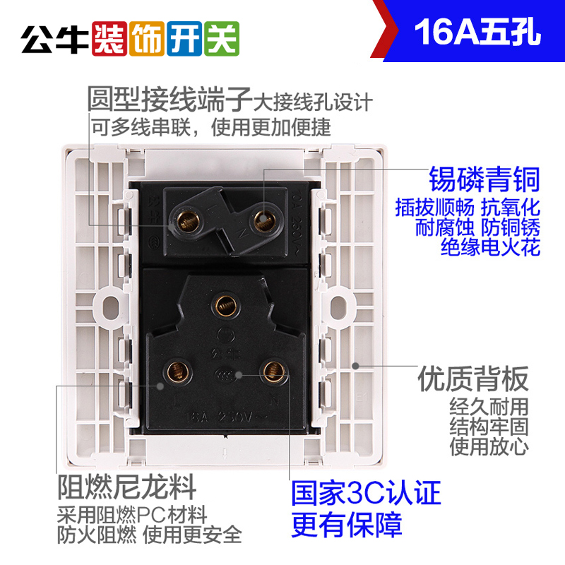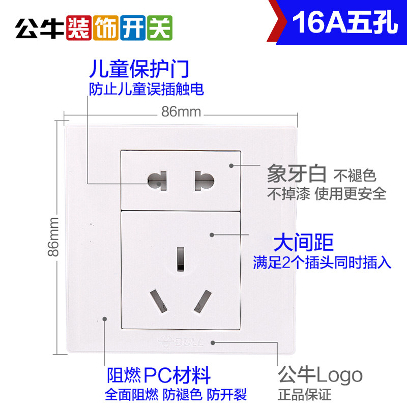 Bull switch socket panel 16A five-hole two-three Plug Power wall decoration 86 type large pitch 5-hole concealed