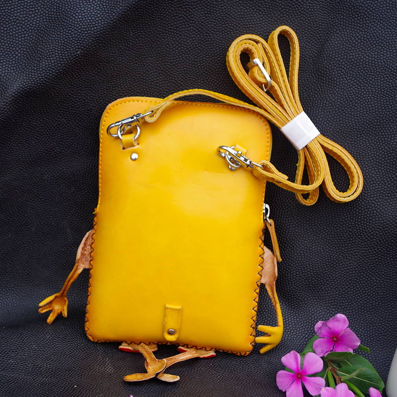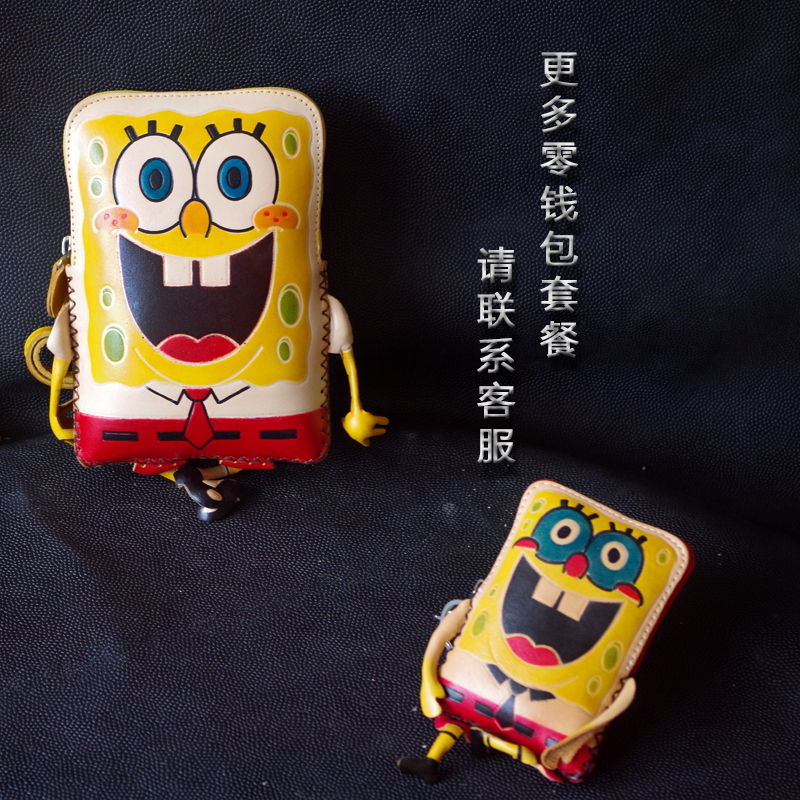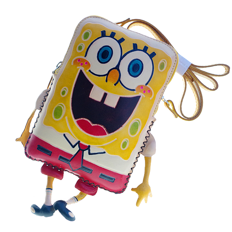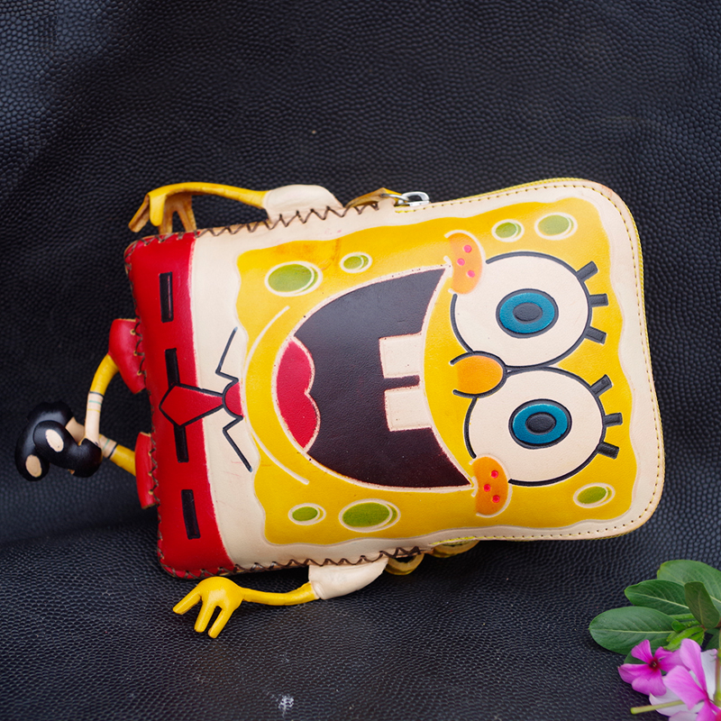 Leather cartoon SpongeBob SquarePants messenger small square bag First layer cowhide 6P7P mobile phone bag One-shoulder three-dimensional modeling bag