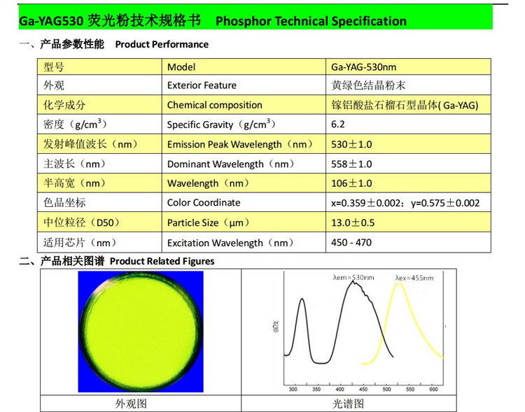 Ce:Ga-YAG 530nm yellow-green phosphor for high brightness and high color rendering index white LED