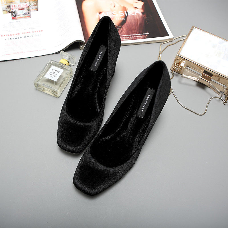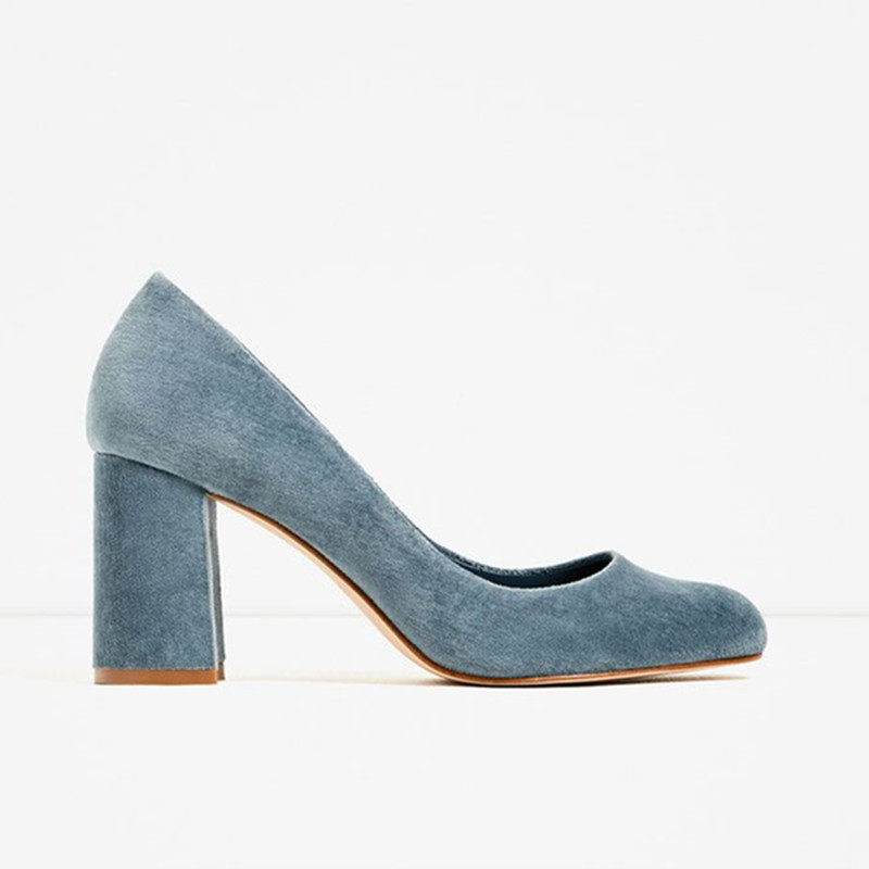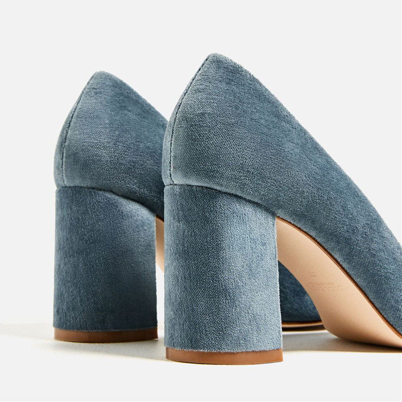 Velvet high heel shoe woman retro square head coarse heel single shoe 2022 new light mouth suede blue 100 hitch commuter OL