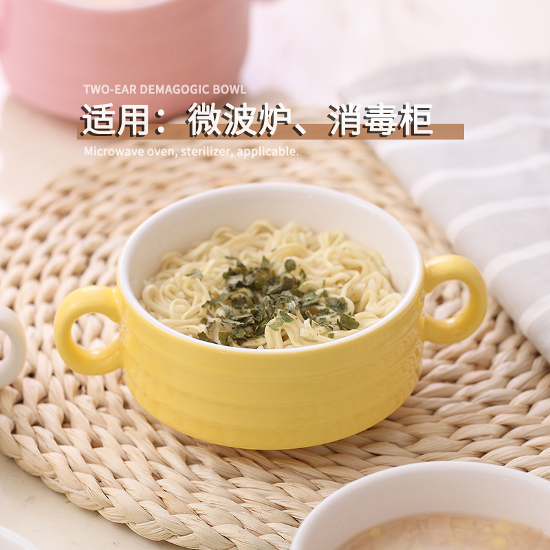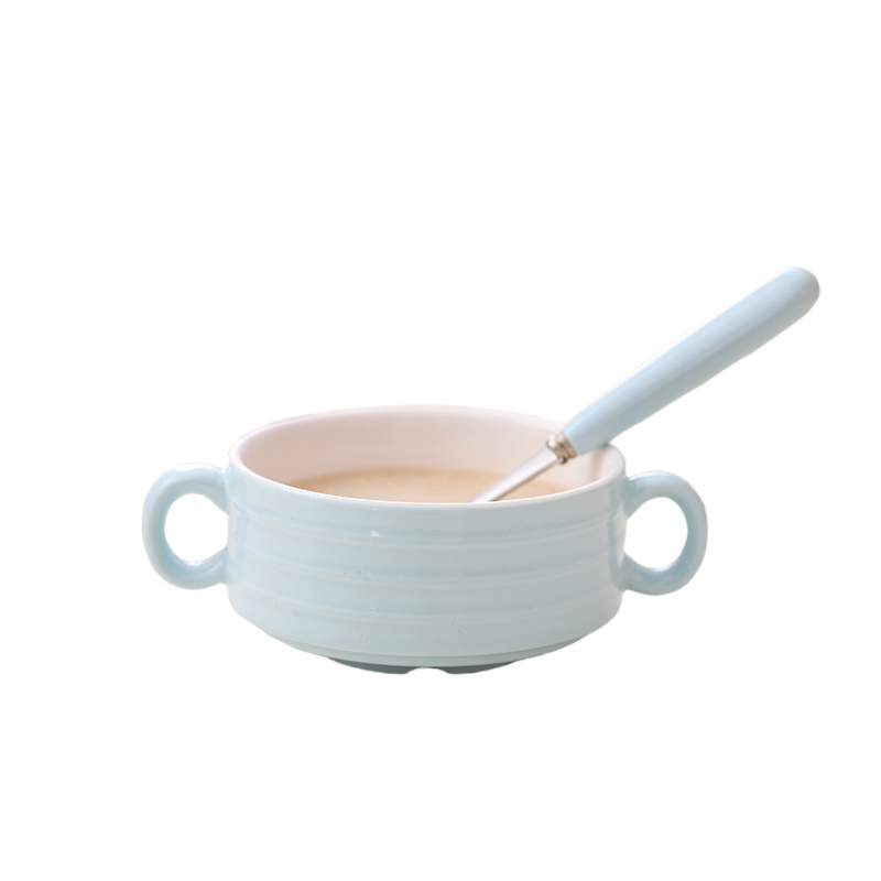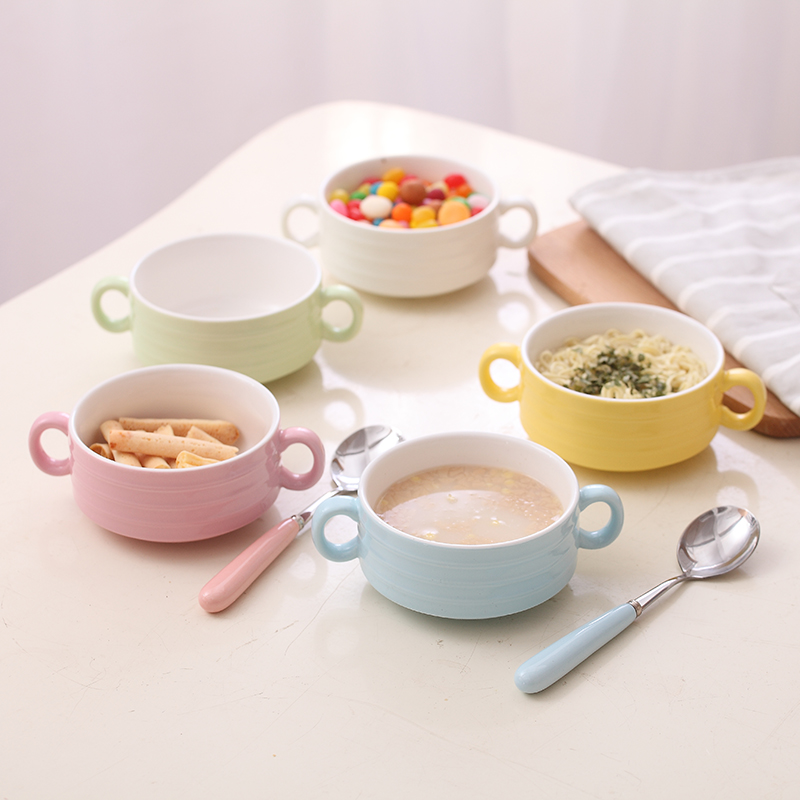 Pure white stripes Double-eared bowl with pink stripes Double-eared bowl with sky blue stripes Double-eared bowl with orange stripes Double-eared bowl with light green stripes Double-eared bowl with red powder porcelain handle Spoon sky blue porcelain handle Spoon orange
