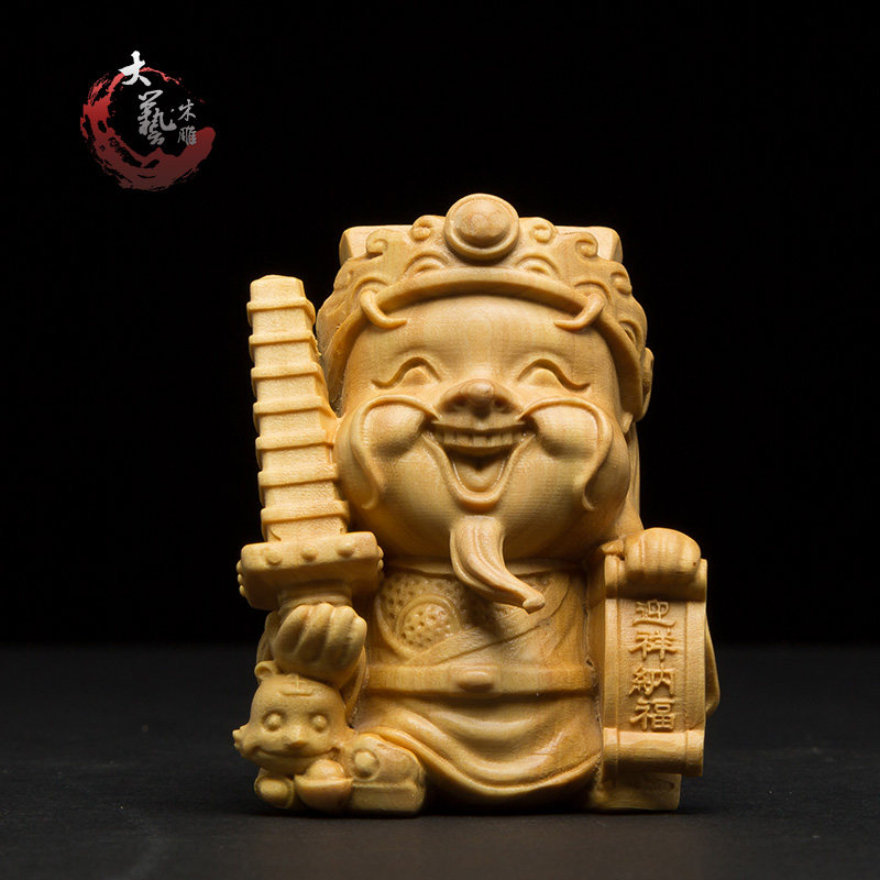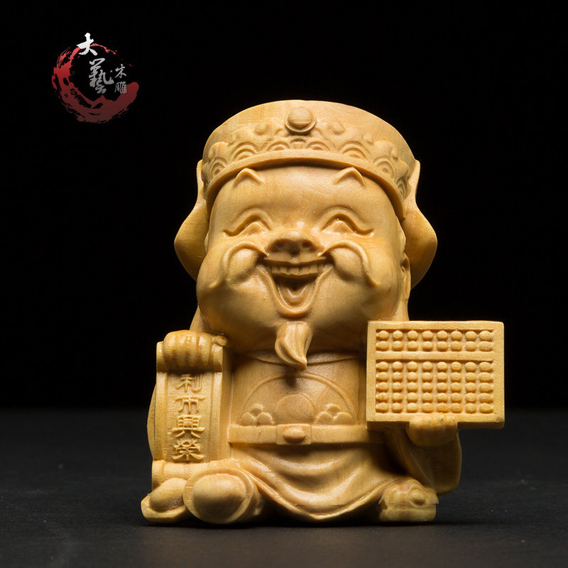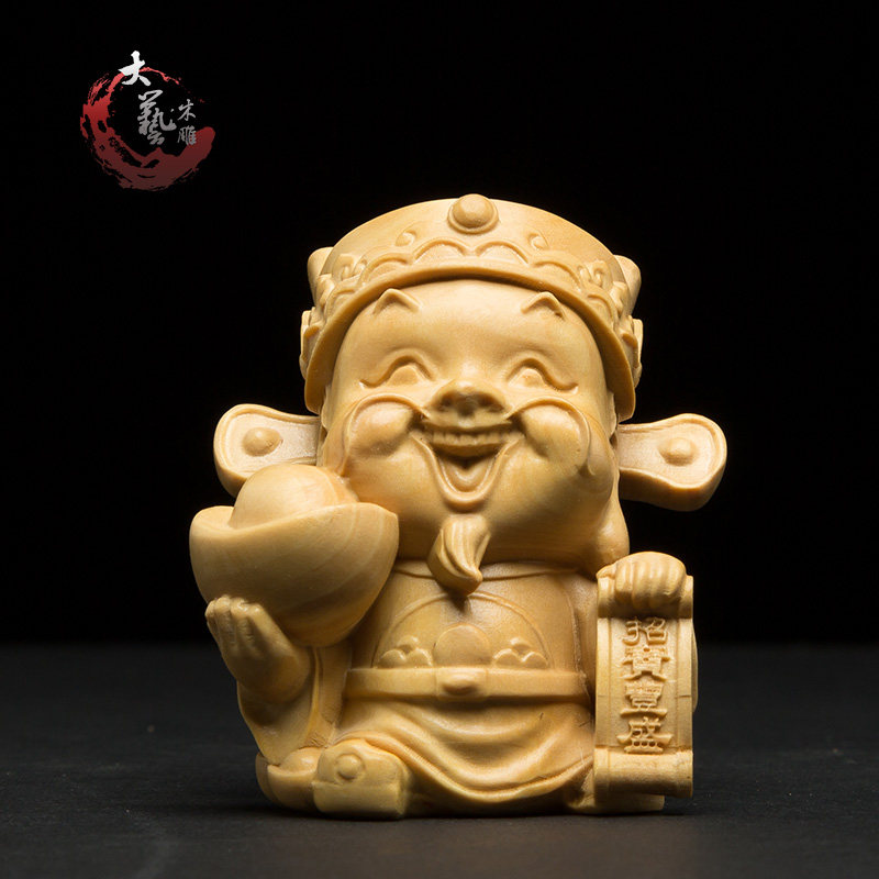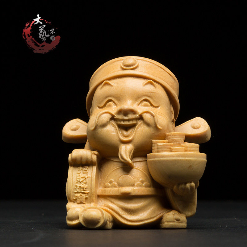 Yellow Poplar Wood Carving with handlebar piece boutique solid wood Chinese engraving handicraft Q version of Buddha swing piece 5-way financial god-Taobao