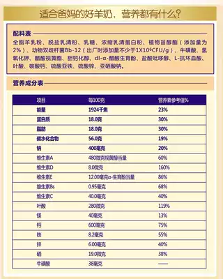Raw goat's milk Desalted whey powder Malt milk concentrate Whey protein powder Taurine Vitamin C Vitamin E Vitamin A Folic acid Vitamin D