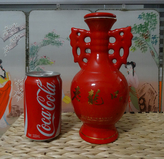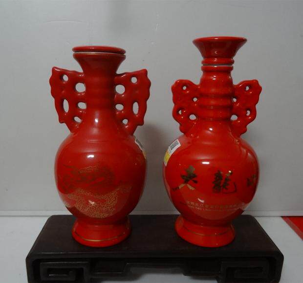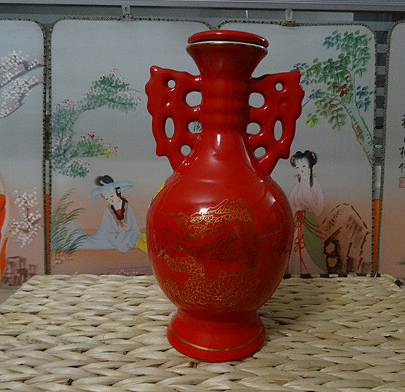Red Porcelain Wine Bottle Vase Retro Double Ear Sketching Wine Bottle Pan Dragon Pattern Dragon Motif Art Styling Bottle Collection Hem
