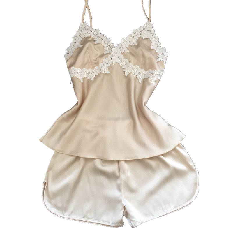 New Pint Harness Pyjamas White Lace Emulation Silk Desirable Chest Cushion Harness Shorts Shorts Deep V Sexy Sleepwear Women Summer